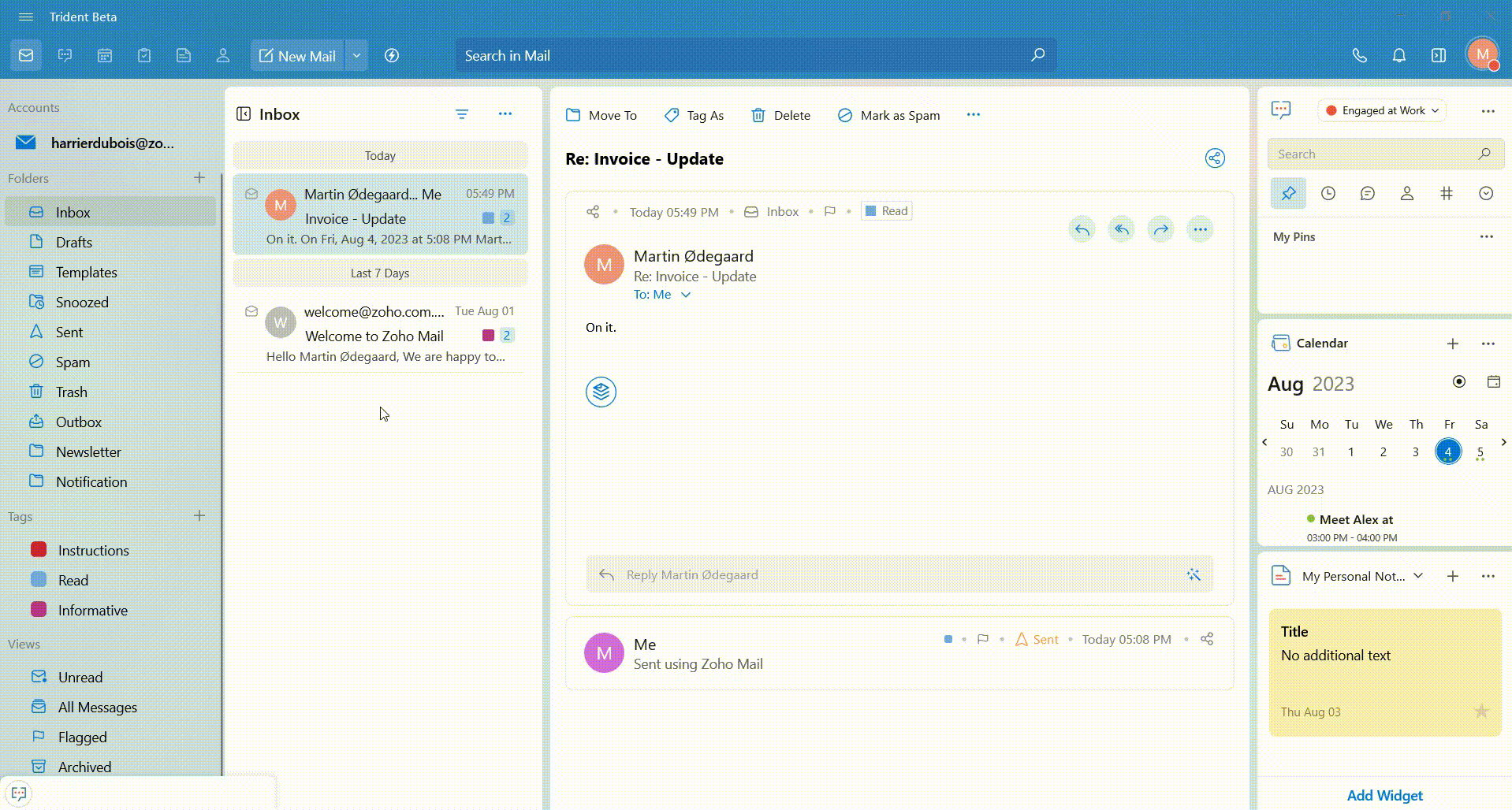 Upon launching Zoho Trident, your initial view is Zoho Mail. The functionality available to you renders Zoho Mail superior to Outlook in terms of both features and stability.