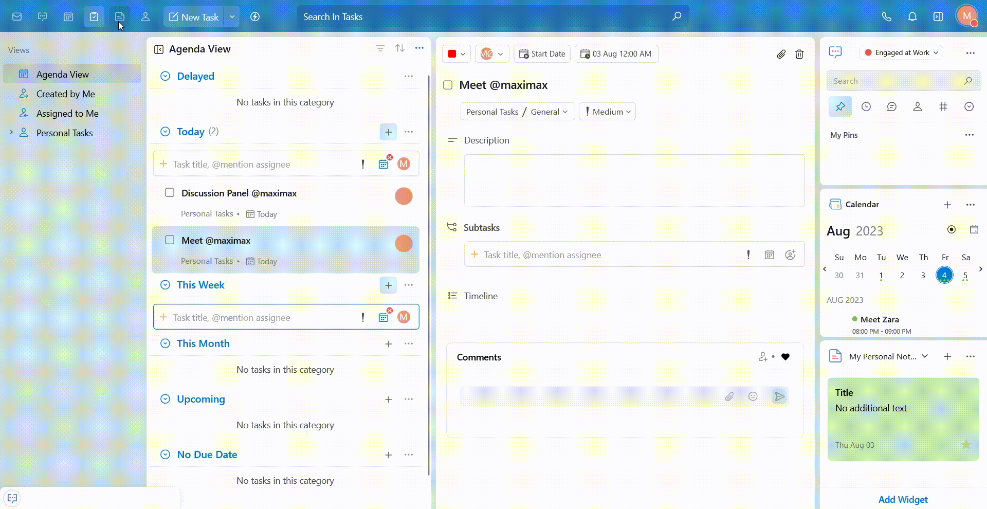 In Calendar, swiftly add Events with a single click, or access Tasks for efficient task management. Within the Agenda View tab, click on “+” to incorporate a Task, and utilize “@” to mention the task’s assignee responsible for its completion.