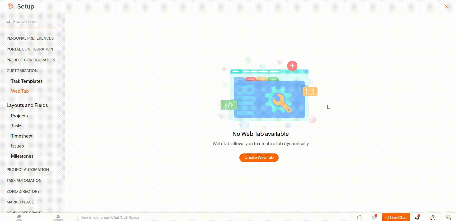 To create a Web Tab, click on the Setup and navigate to Web Tab under Customizations.