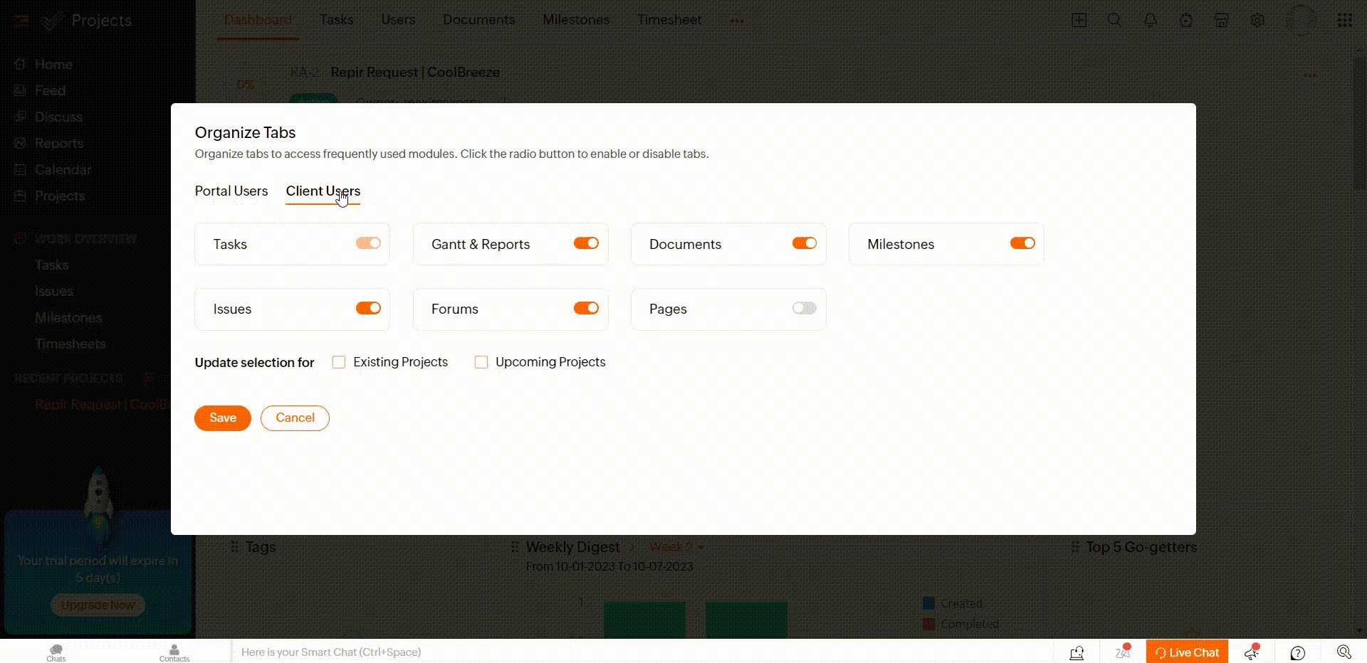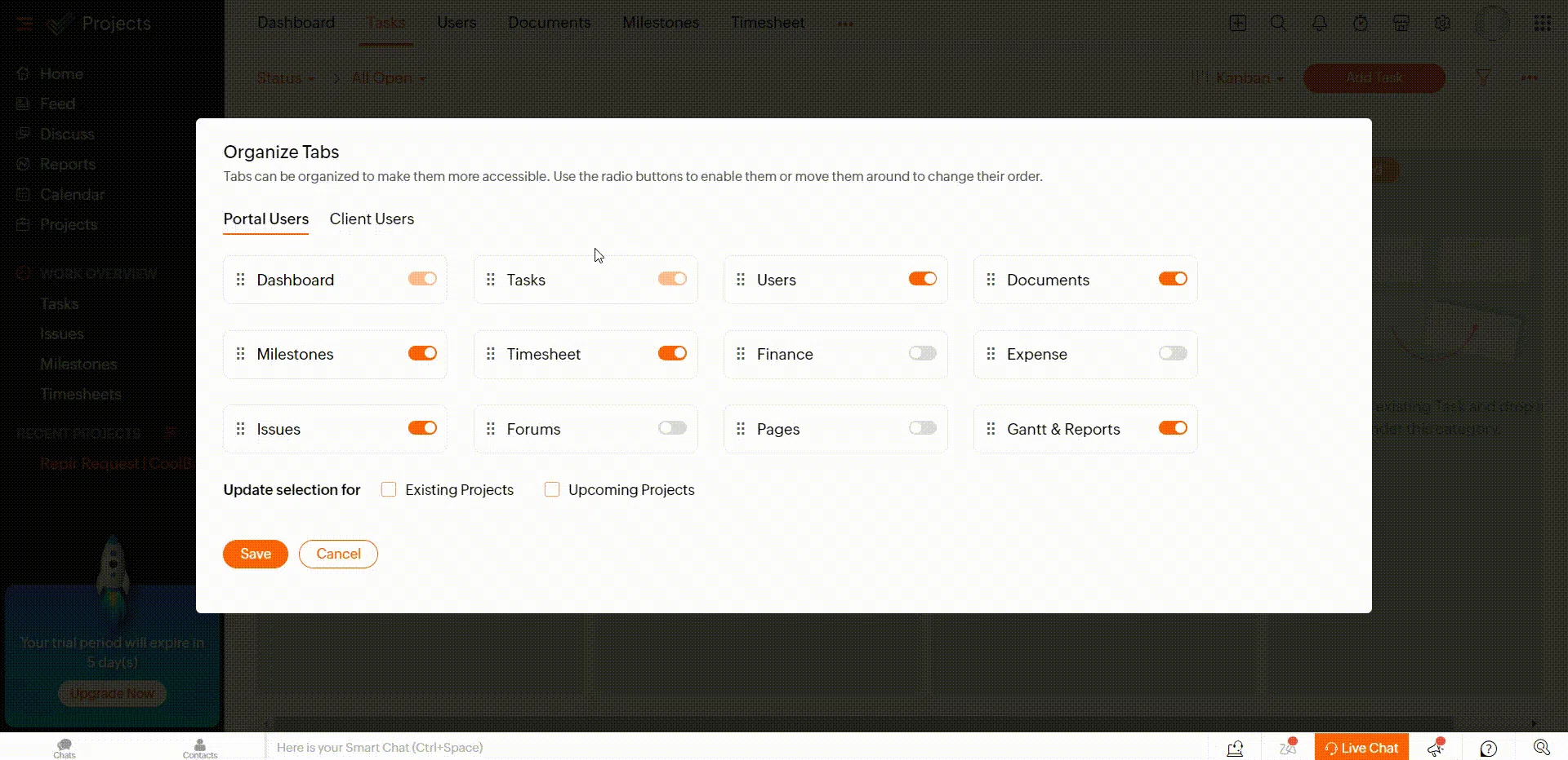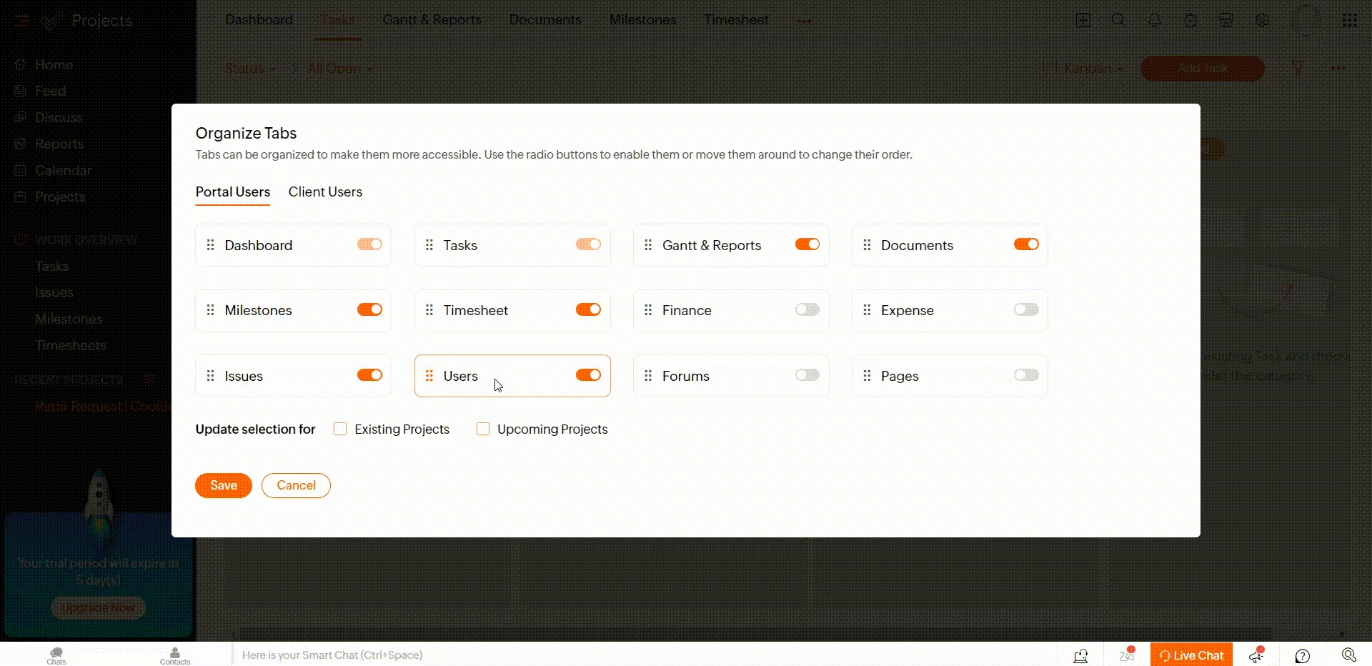 If you want the changes in tab visibility to apply to existing and upcoming projects, select the checkbox labeled “Update the changes in existing/upcoming projects“ and then click the Save button to save your tab organization settings.
