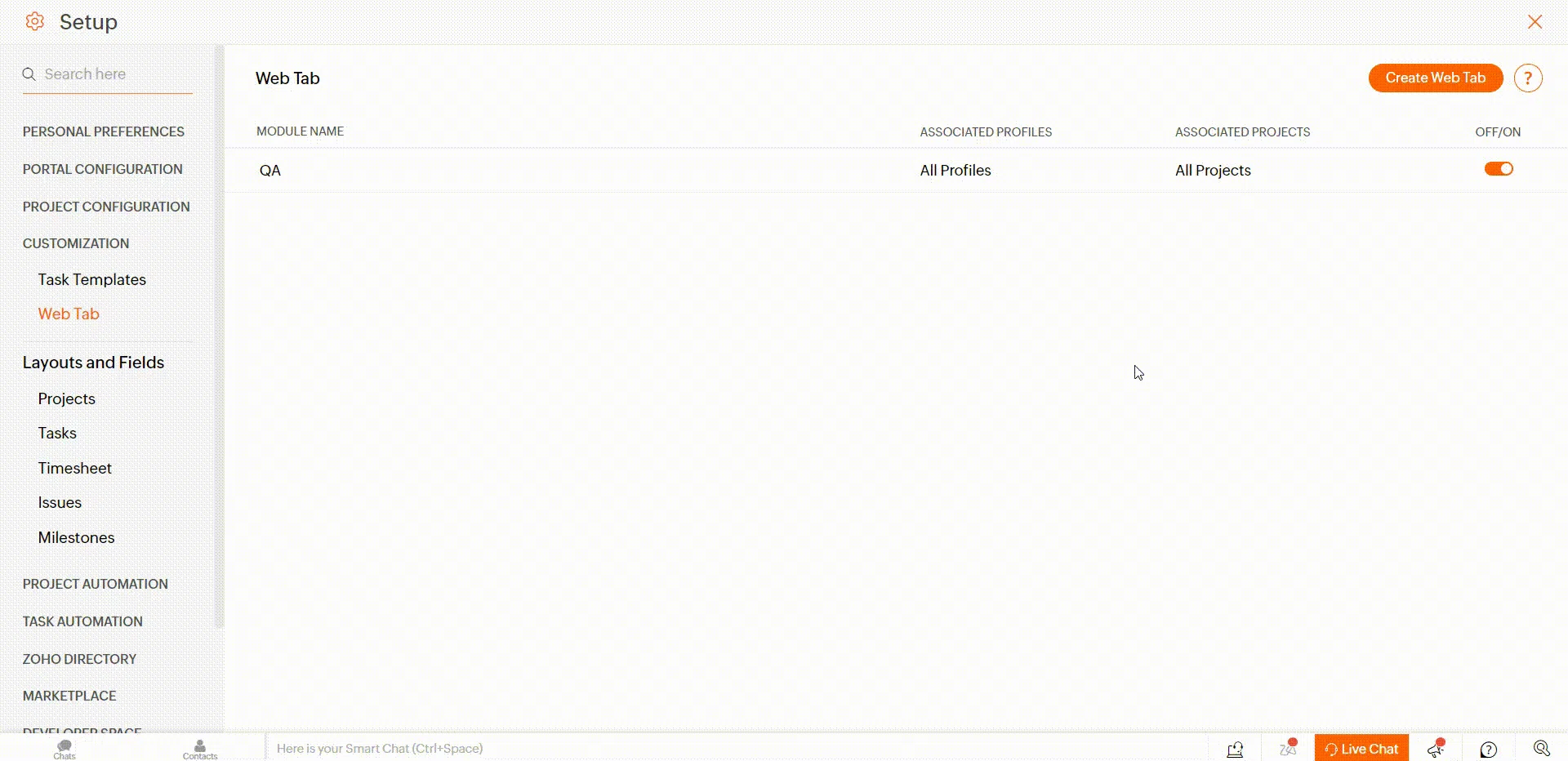 To view and manage Web Tabs, click Projects in the left navigation panel, go to the Organize Tabs section, and review all the modules, including Web Tabs.
