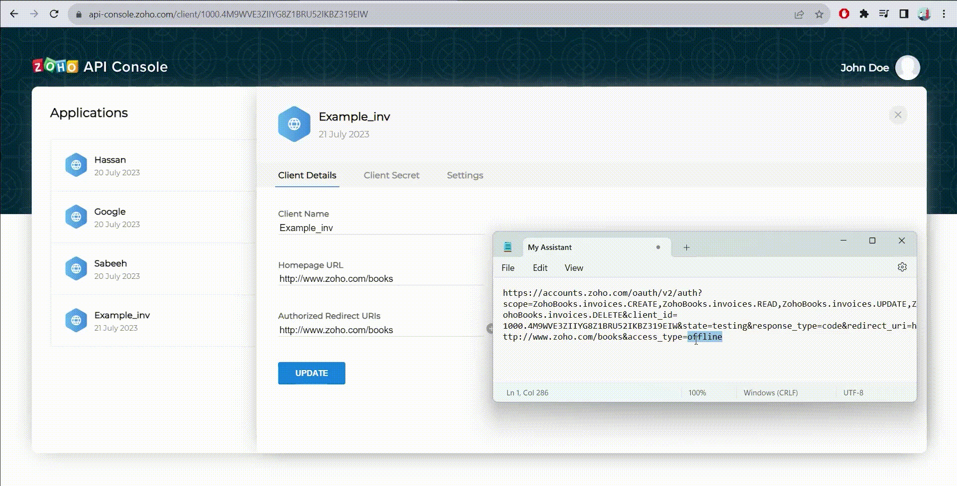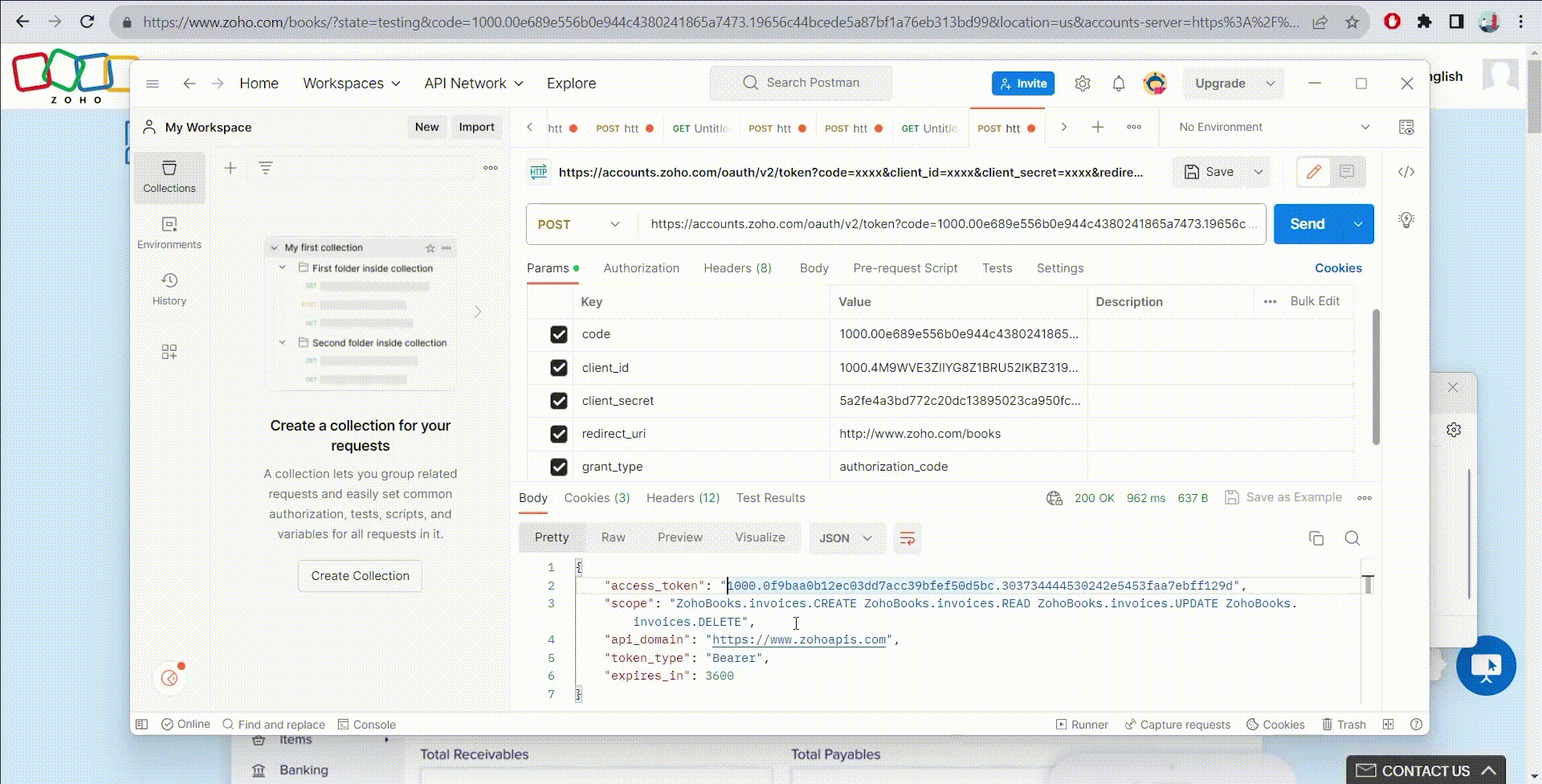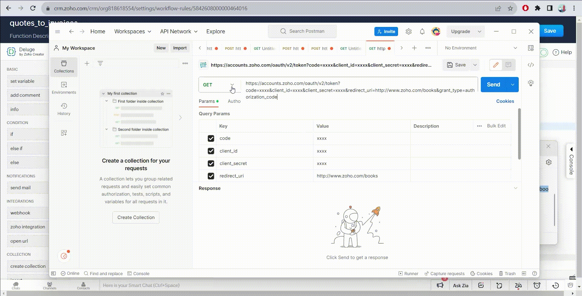 Next, use your client information to modify the following link and generate a code. Replace xxxx with ZohoBooks.invoices.CREATE,ZohoBooks.invoices.READ,ZohoBooks.invoices.UPDATE,ZohoBooks.invoices.DELETE, and yyyy with your Client ID, as well as zzzz with your Authorized Redirect URIs in the provided link: