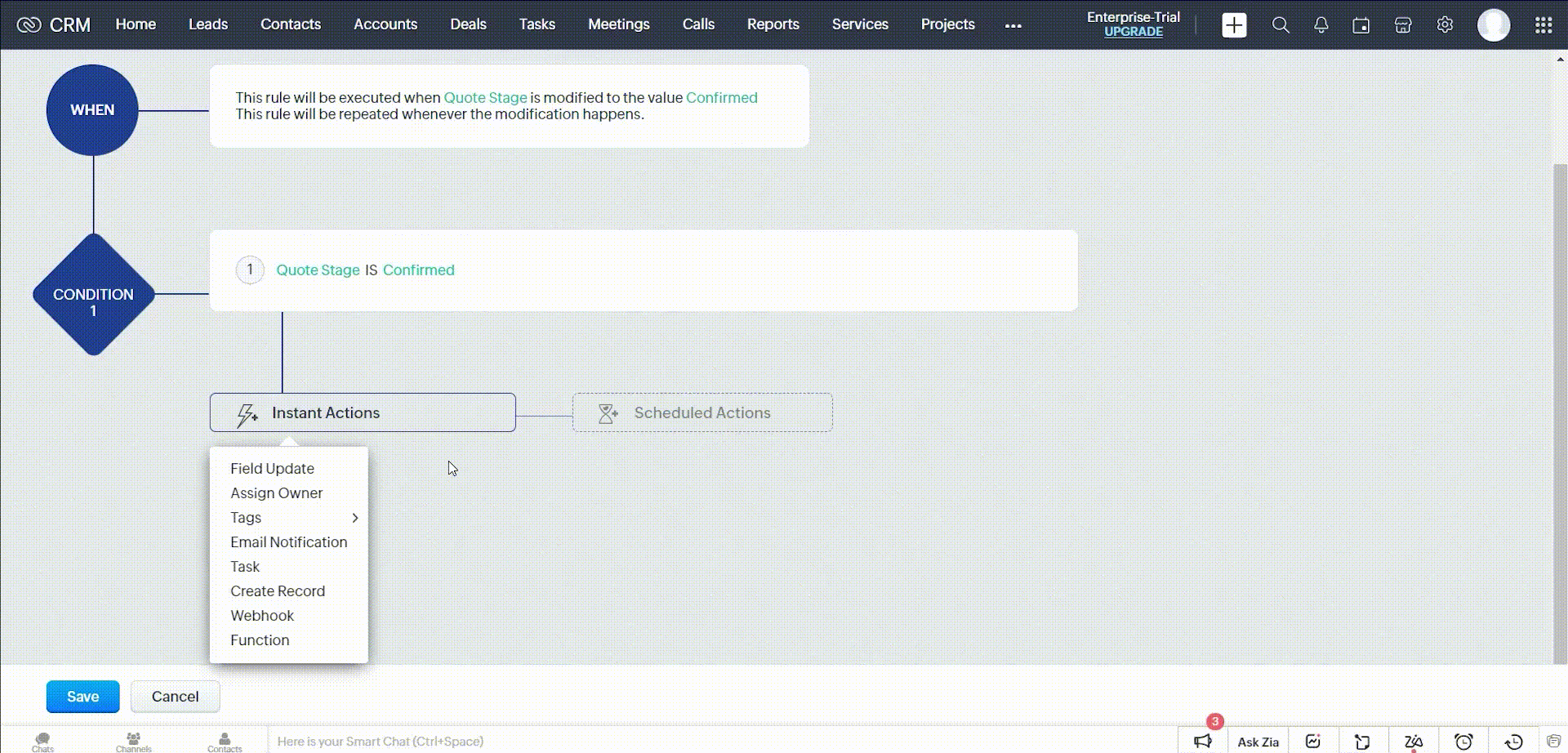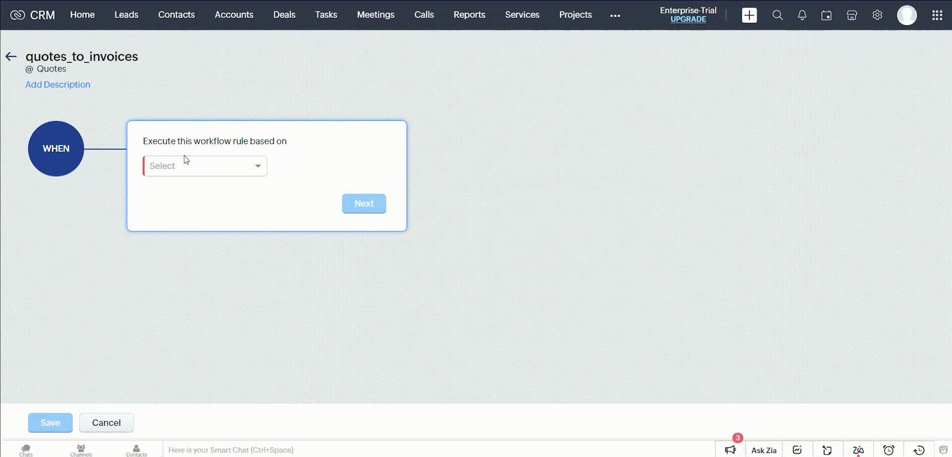 To begin, access Zoho CRM and navigate to Setup. From there, head to Automation and select Workflow Rules.