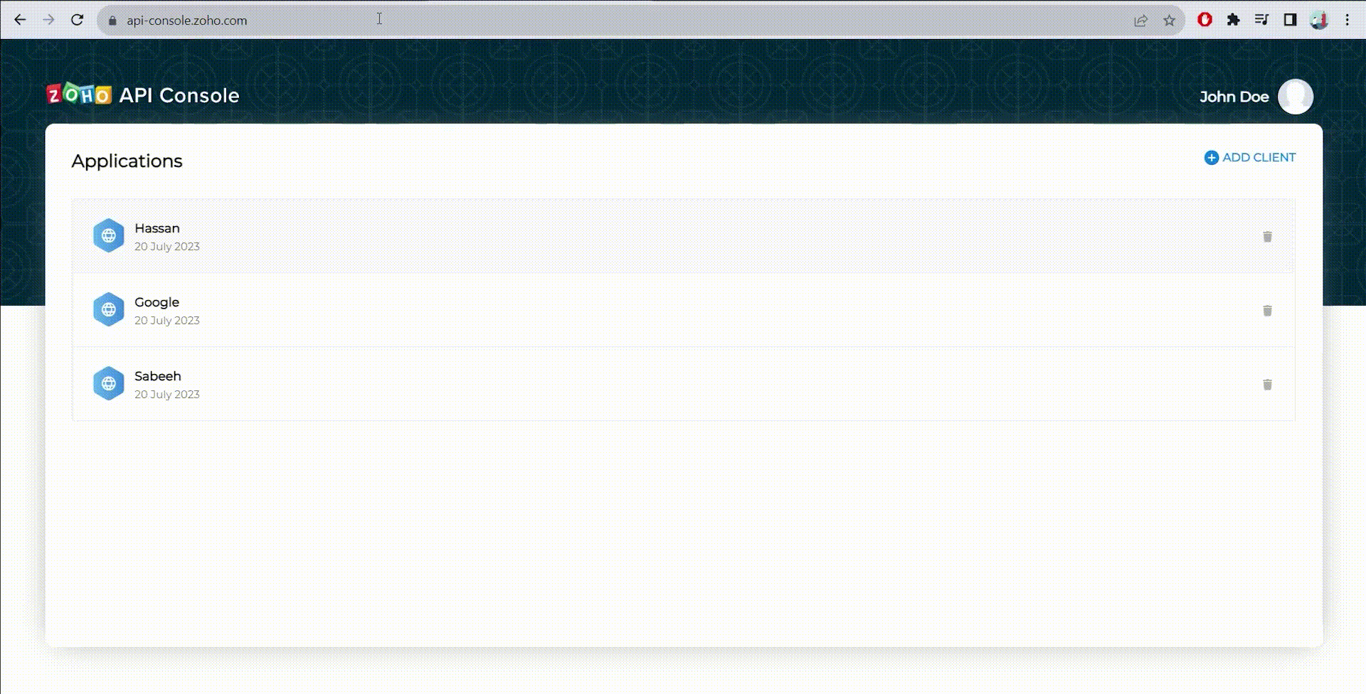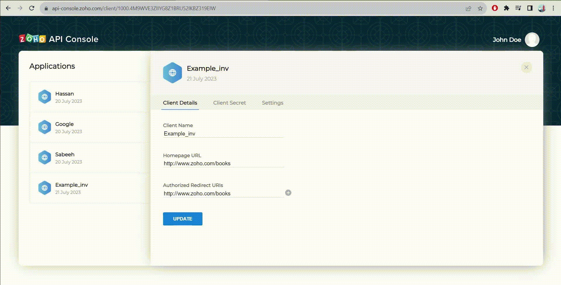 Follow the link and click on Create New Client. Choose Server-based Applications as the Client type. Enter your desired Client Name, and use ‘http://www.zoho.com/books‘ as both your Homepage URL and Authorized Redirect URIs.