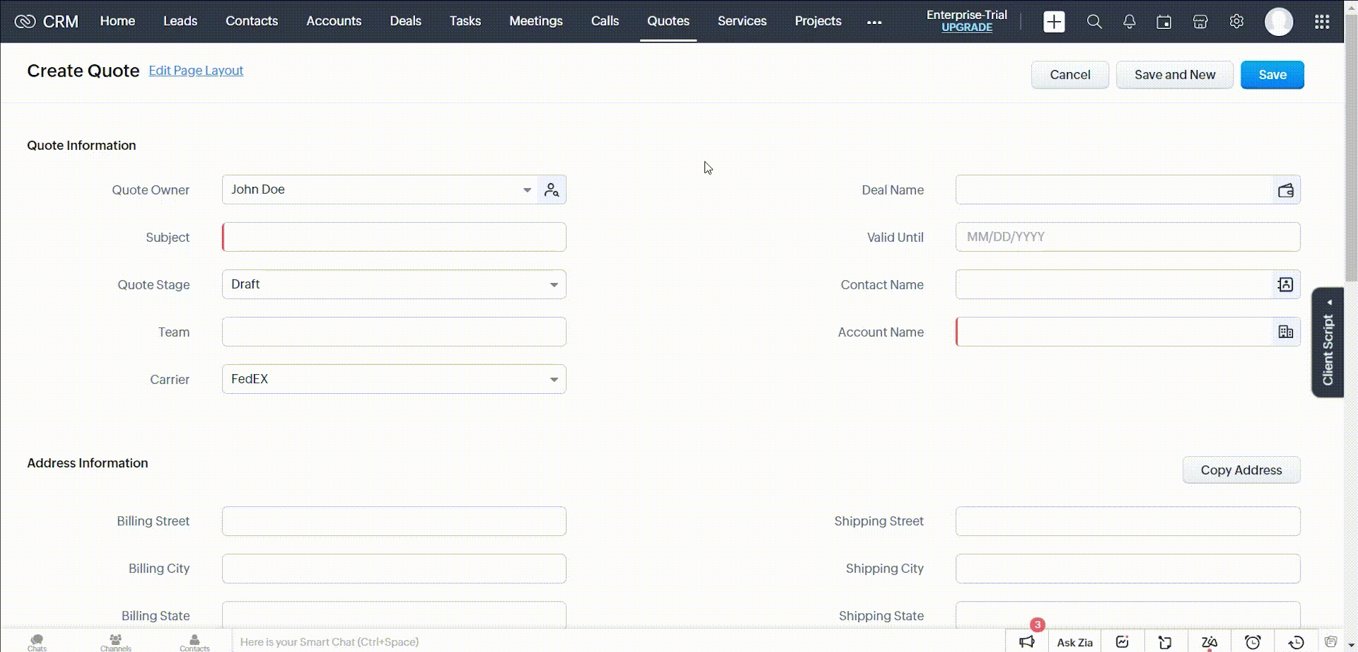 Begin by providing a Subject for the quote and proceed to select a Deal Name, Account Name, and other quote details.