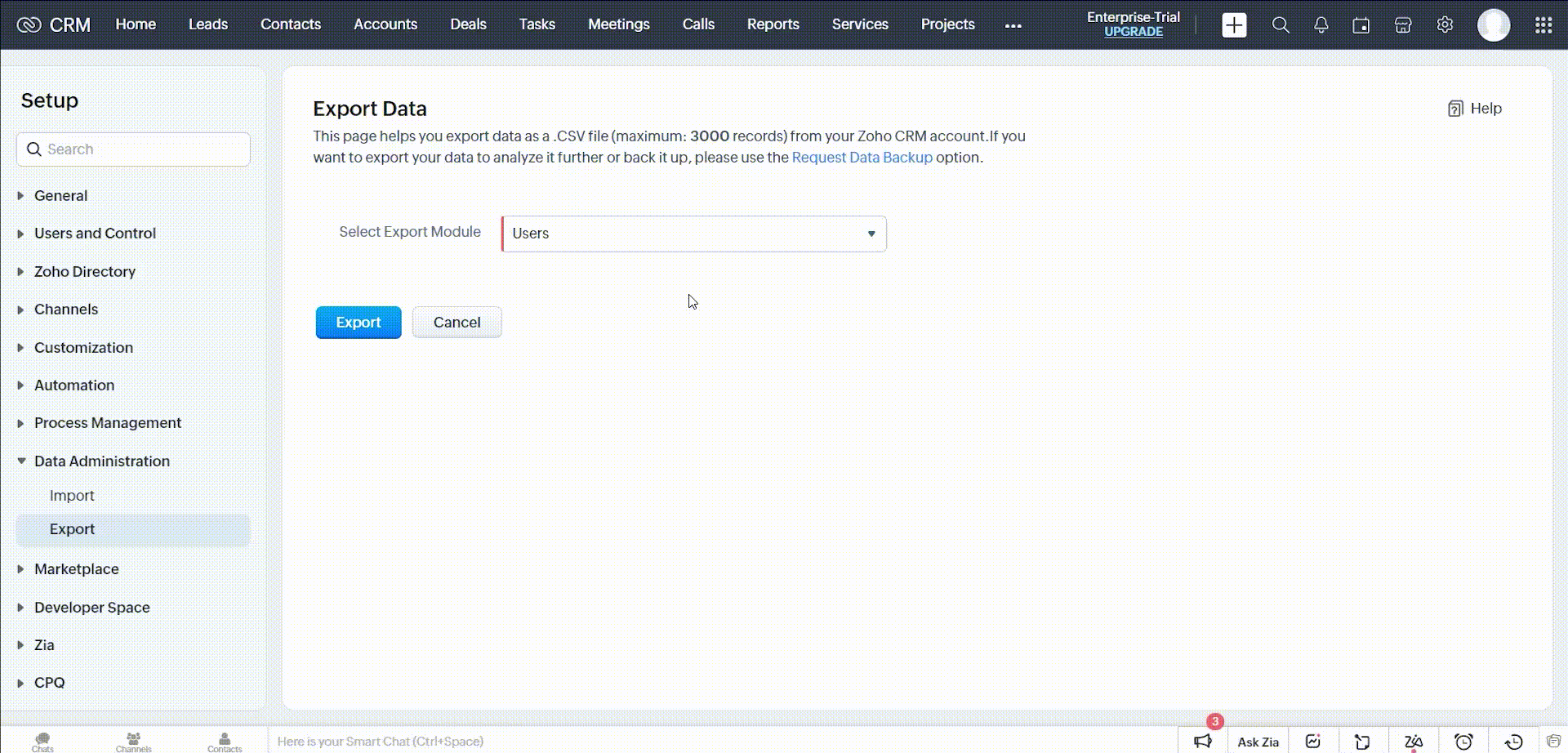 [Note: This is a one-time process for initial setup.]To export the CSV file containing your quotes data in Zoho CRM, access the Setup section, navigate to Data Administration, and then click on Export.