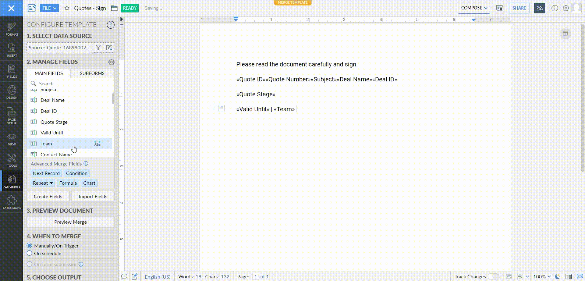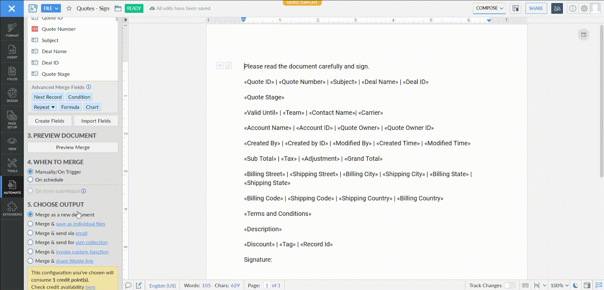 Manage the fields accordingly and populate the template with quote fields. To finalize the template, click on Preview Merge to preview the document.