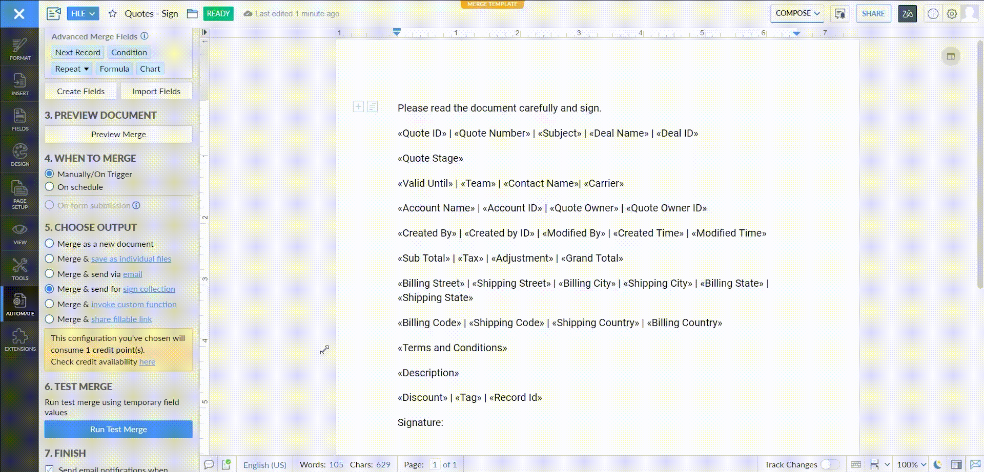The Quotes data in the template will be sent to the signer by clicking on Run Merge. Proceed to select Run Merge and then click on Send for Collection.