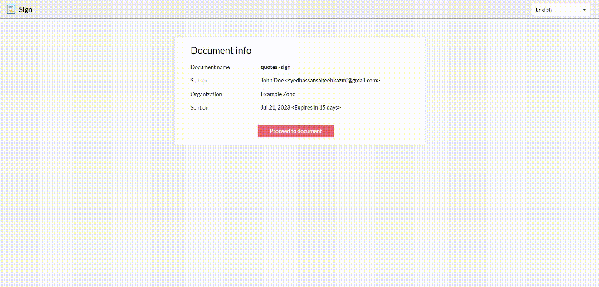 The signer will open the email, proceed to the document by clicking on Proceed to document, then select Agree & Continue. After writing their signature and clicking the OK button, they will finalize the signing process by clicking on the Finish button.