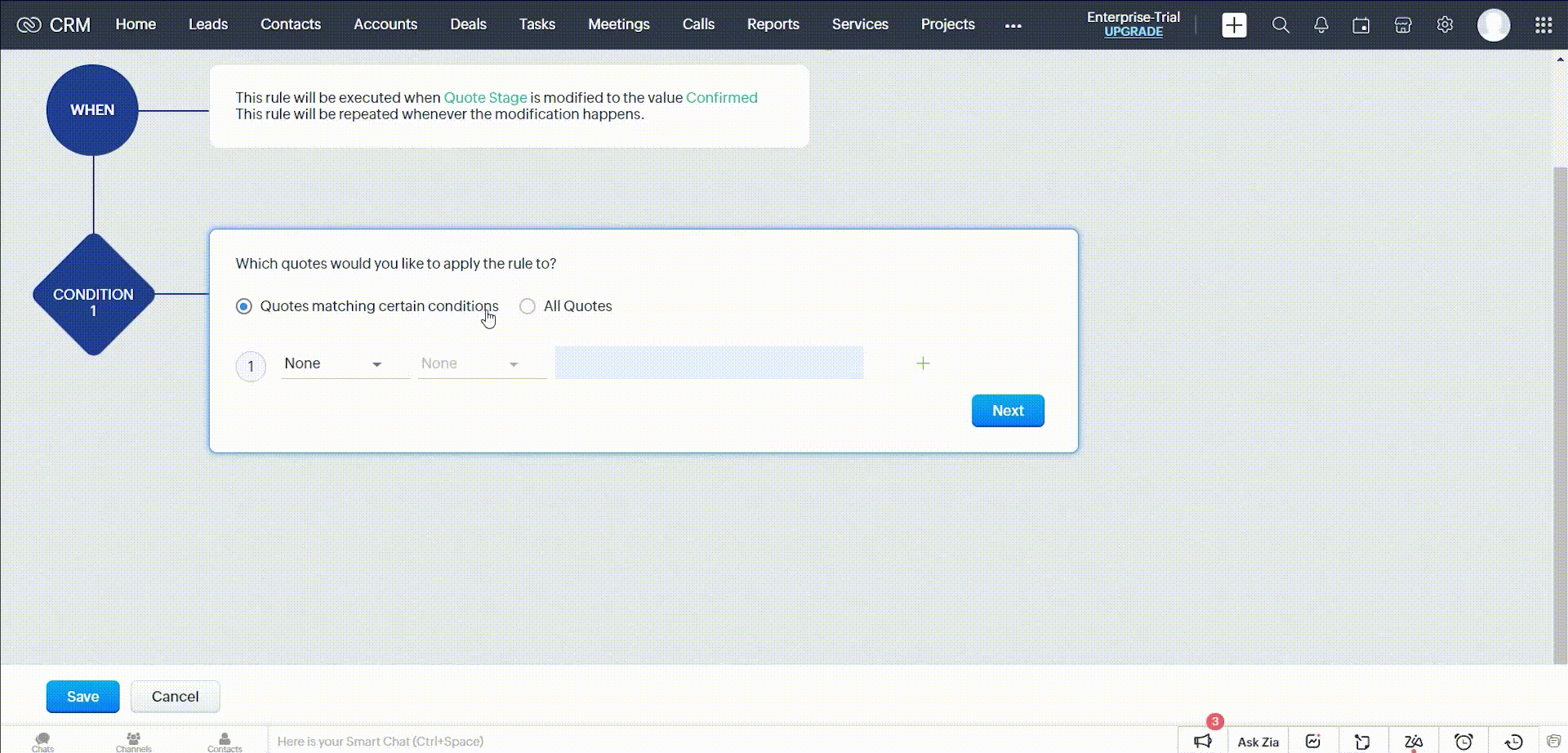 Thus far, we have established the execution parameters for the workflow rule. Now, let’s define a condition. In the Condition 1 box, choose Quotes matching certain conditions to specify the quotes to which the rule should be applied.