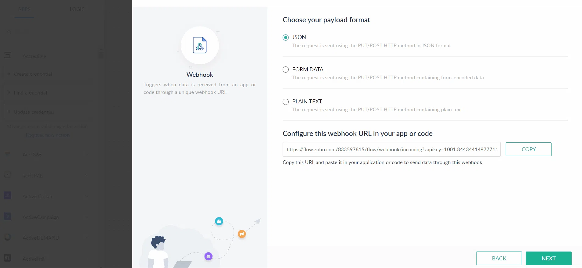 Sign into your Zoho Flow account and create a new flow. Name that flow as per your requirement. Choose a folder as per your requirement and type a description if you want to add one. Then press the Create button. After creation, it will redirect you to the triggers option screen. Choose the Webhook trigger and press the configure button. Then the URL will appear on your screen copy that to paste on the Google form script.