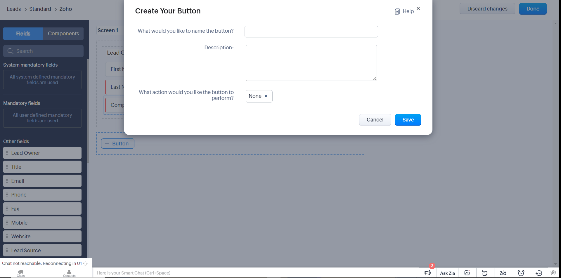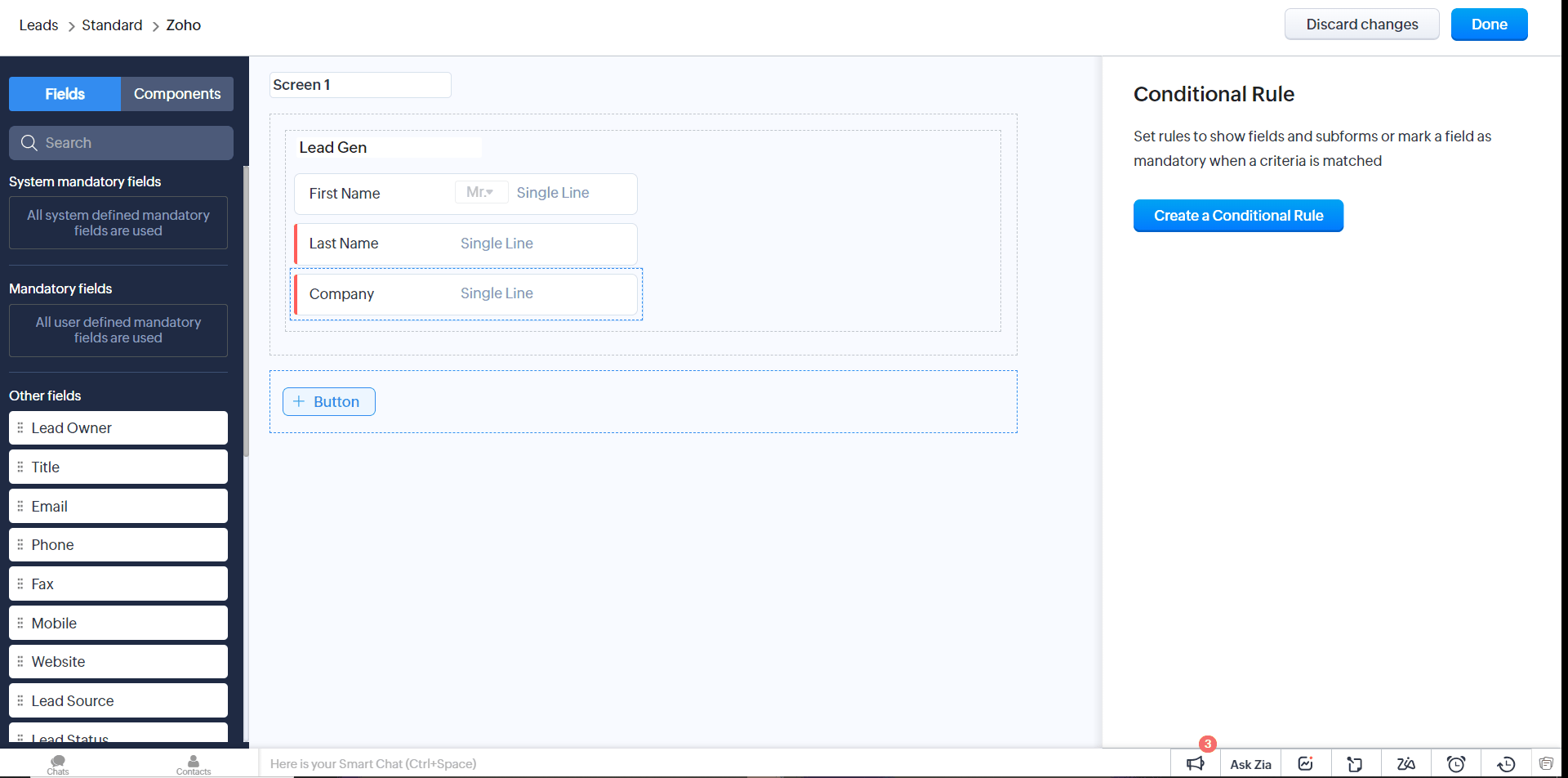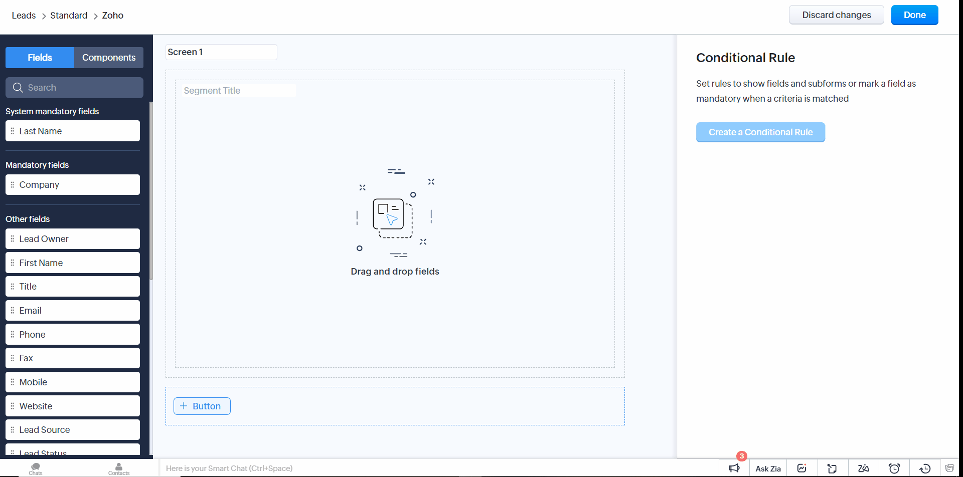 When you select the Lead Generation option, it will redirect to screen 1. You can name Segment Title as Lead Gen. You can drag and drop fields into the defined area and also choose a button. In the button option, you can choose the desired button and also add a custom button if you want to add one. Then press done it will save all the data and redirect you to the main wizard interface page.