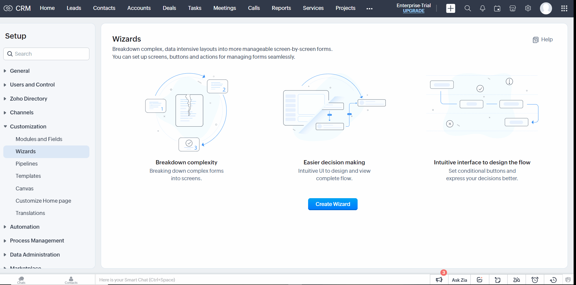 Log in to your Zoho CRM and click on the settings button on the right side. You will find categories with options. On the right side under the customization option, you can find the option of the wizard. Upon clicking on the wizard, you will get the create wizard interface.