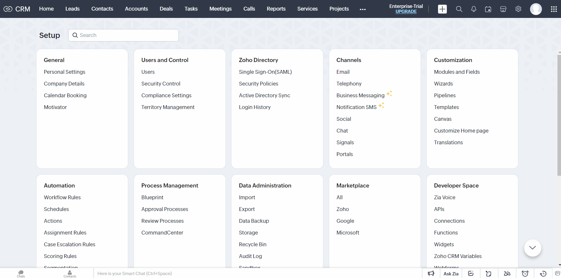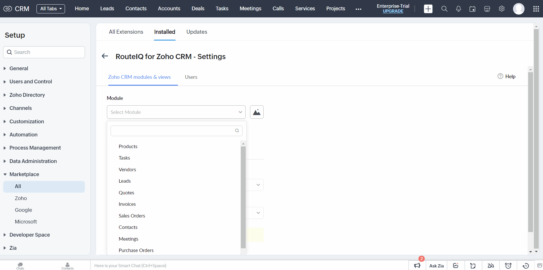First, you have to click on the setup icon at the top right corner of the Zoho CRM dashboard page. Click on the All option in the sub-category of Marketplaces. Here you will find All extensions. In the search bar box, write RouteIQ and it will appear. Two buttons i.e. Start Free Trial and Buy Now will appear.