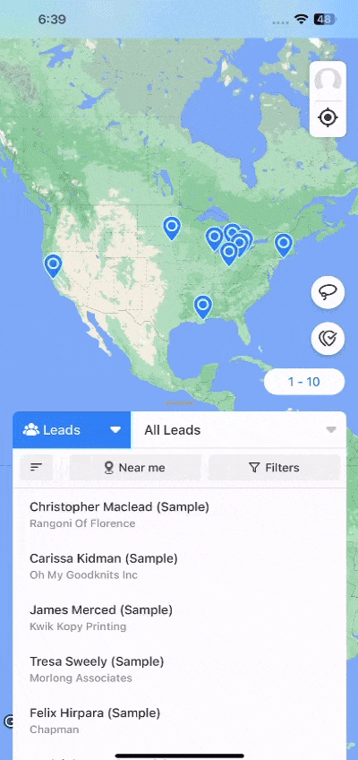 When you install the app, it will show you a map of leads. Click on the list view of lead and it will show you the lead list. With the help of the Lasso tool on the right side of the map, draw a line around the required leads you want to add to the route. Now click on the create route button to create the route of the selected leads.